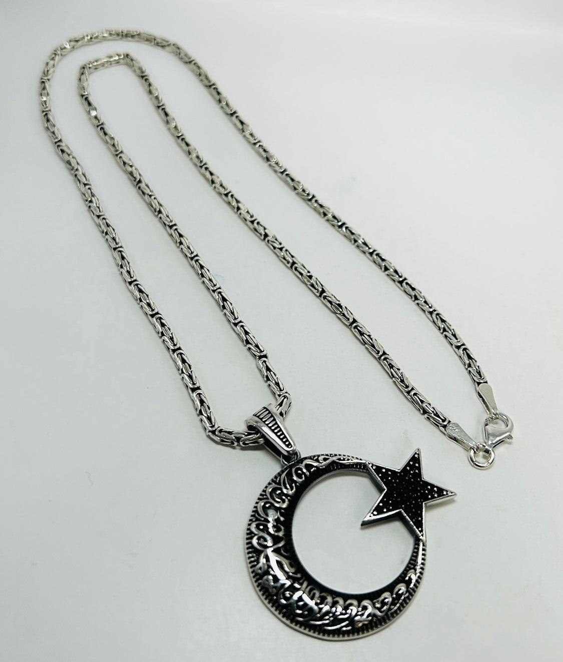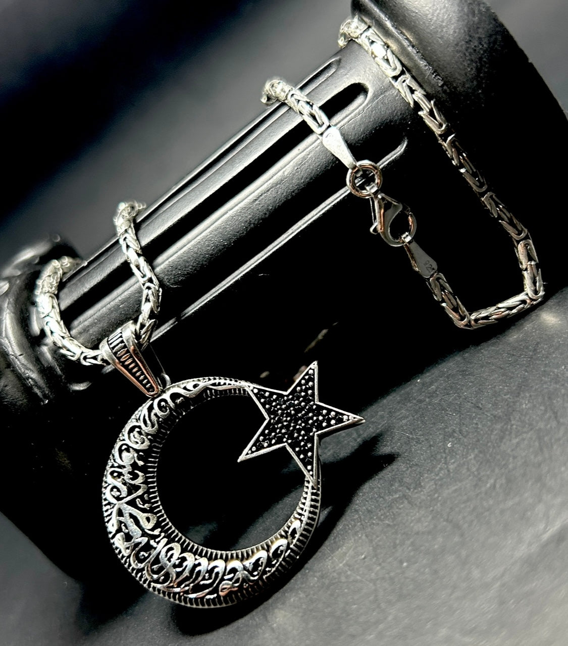 AY YILDIZ Anhänger mit Königskette – 925 Sterling Silber | Kelime-i Tevhid Halbmond Stern Halskette