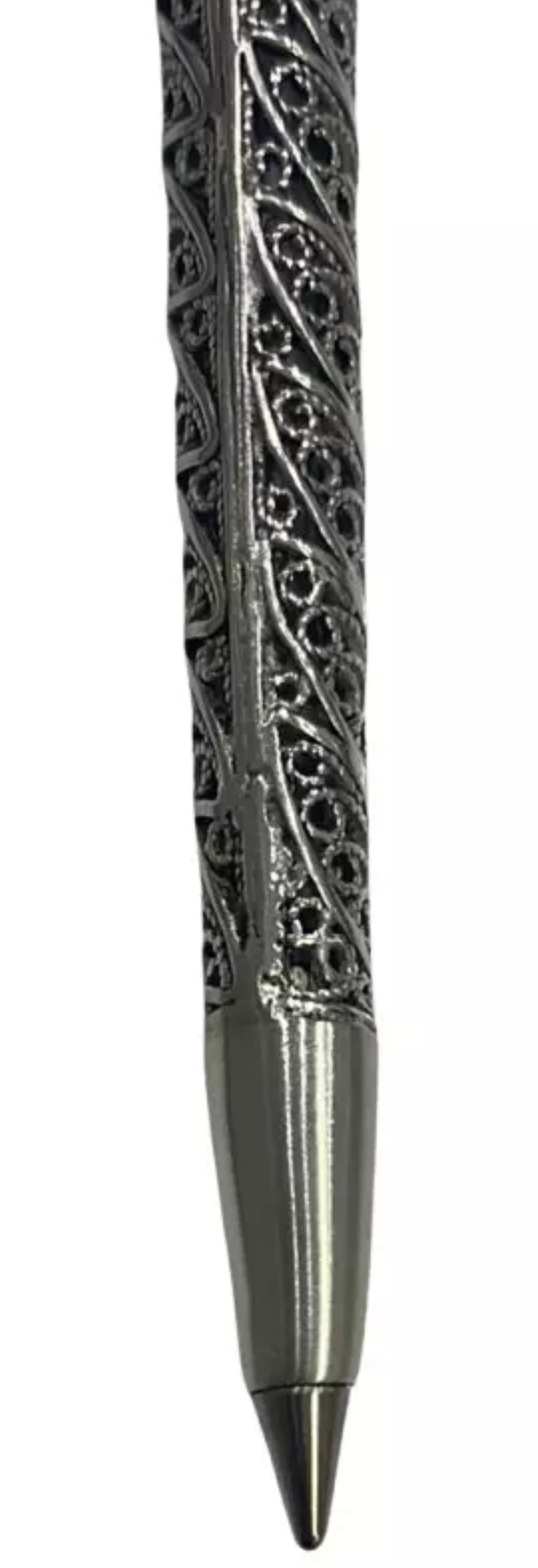 Der Kugelschreiber liegt dank seines massiven Metallkörpers angenehm schwer in der Hand und verleiht jedem Schriftstück Würde und Charakter. Der passende Halter im gleichen Design ist nicht nur ein praktisches Zubehör, sondern auch ein dekoratives Statement auf jedem Schreibtisch. Beide Elemente sind handgefertigt und aus massivem Sterling Silber gefertigt – für eine besondere Ausstrahlung und langanhaltende Qualität.