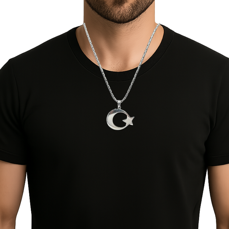 Dieser kunstvoll handgefertigte AY YILDIZ Anhänger zeigt den Halbmond mit Stern (Hilal) und Wolf – inspiriert von osmanischen, türkischen und Göktürk-Motiven. Dazu eine massive 925er Silber-Königskette – ein ausdrucksstarkes Set für Herren mit Stil.