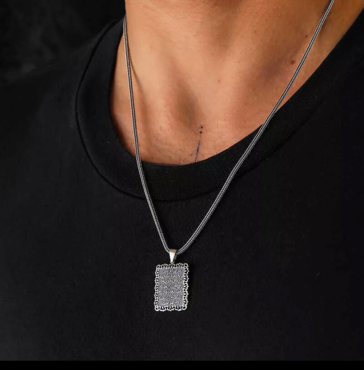 Der filigrane Anhänger enthält die vollständige Ayatul-Kursi (Vers 255 der Sure Al-Baqara), ein im Islam hoch geschätzter Schutzvers. Die oxydierte Oberfläche verleiht der Kette einen antiken Charakter.