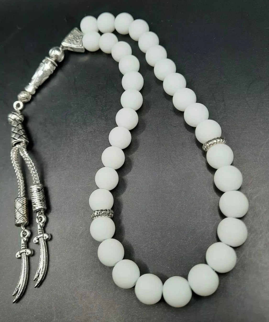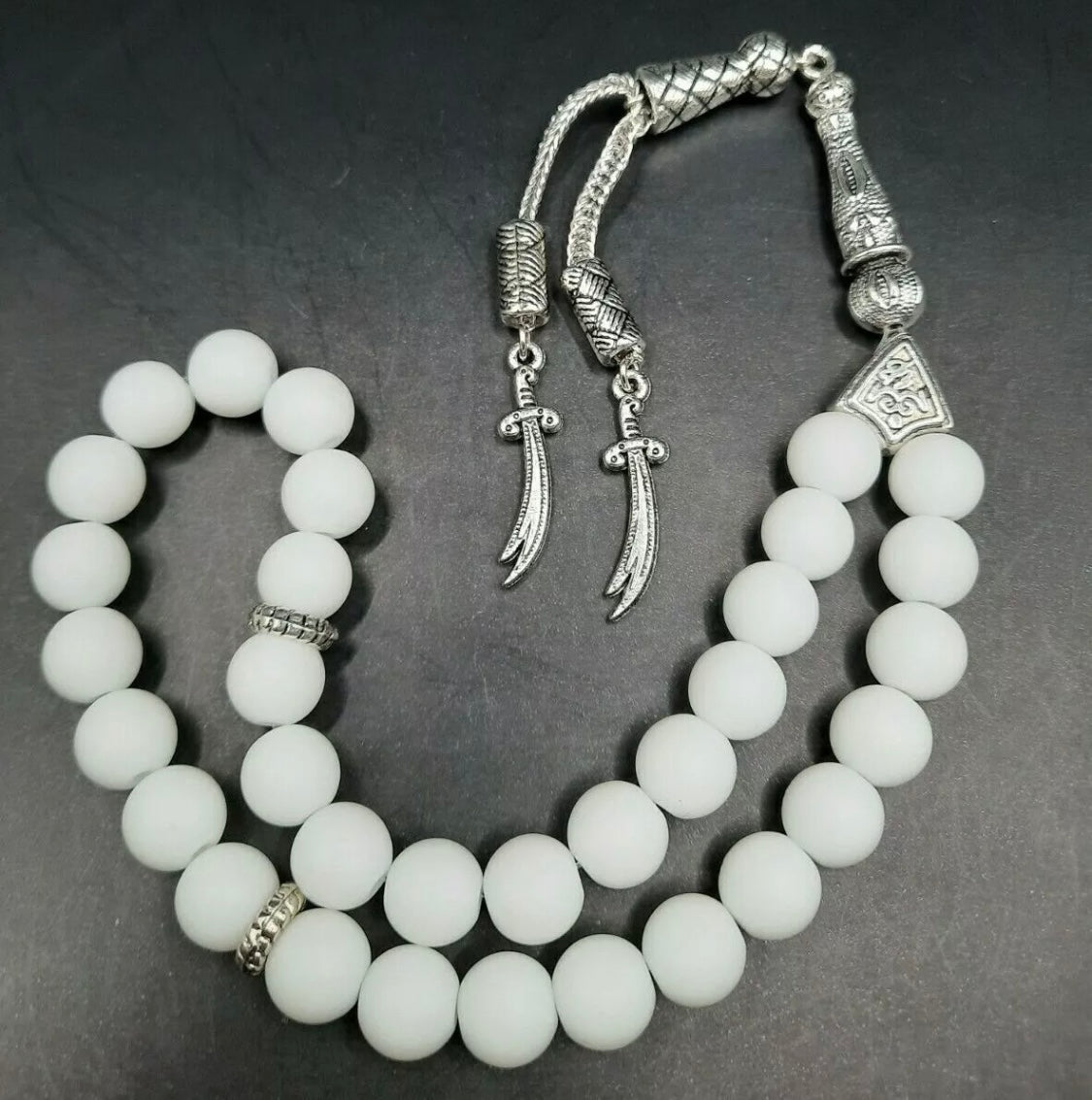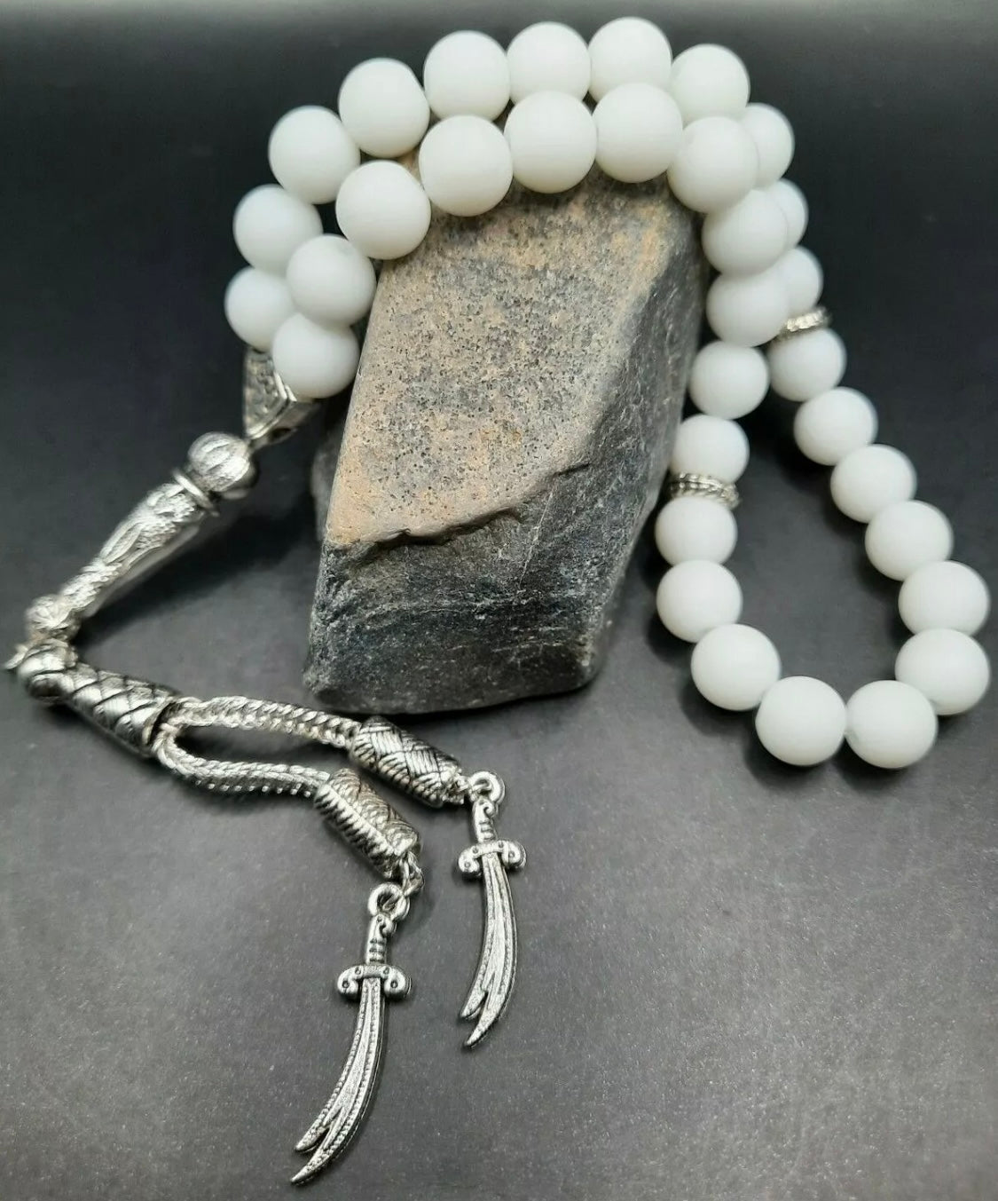 Onyx Tesbih – Handgefertigte Gebetskette mit Zülfikar-Anhänger - weiß aus Naturstein