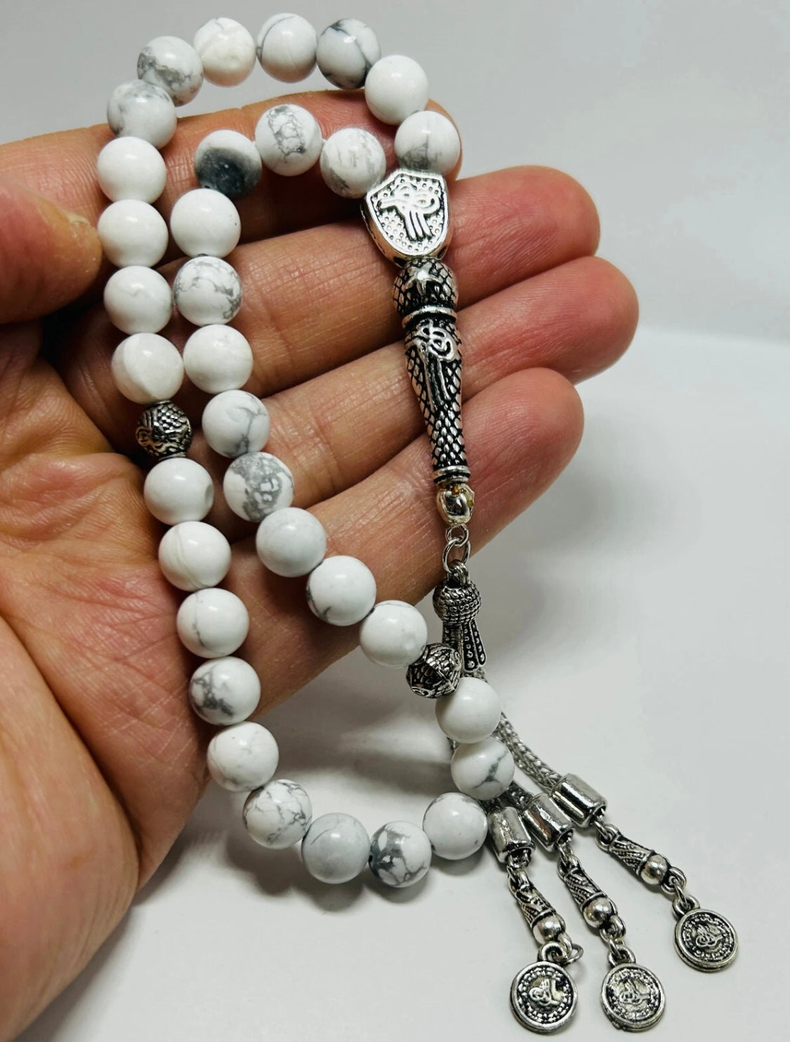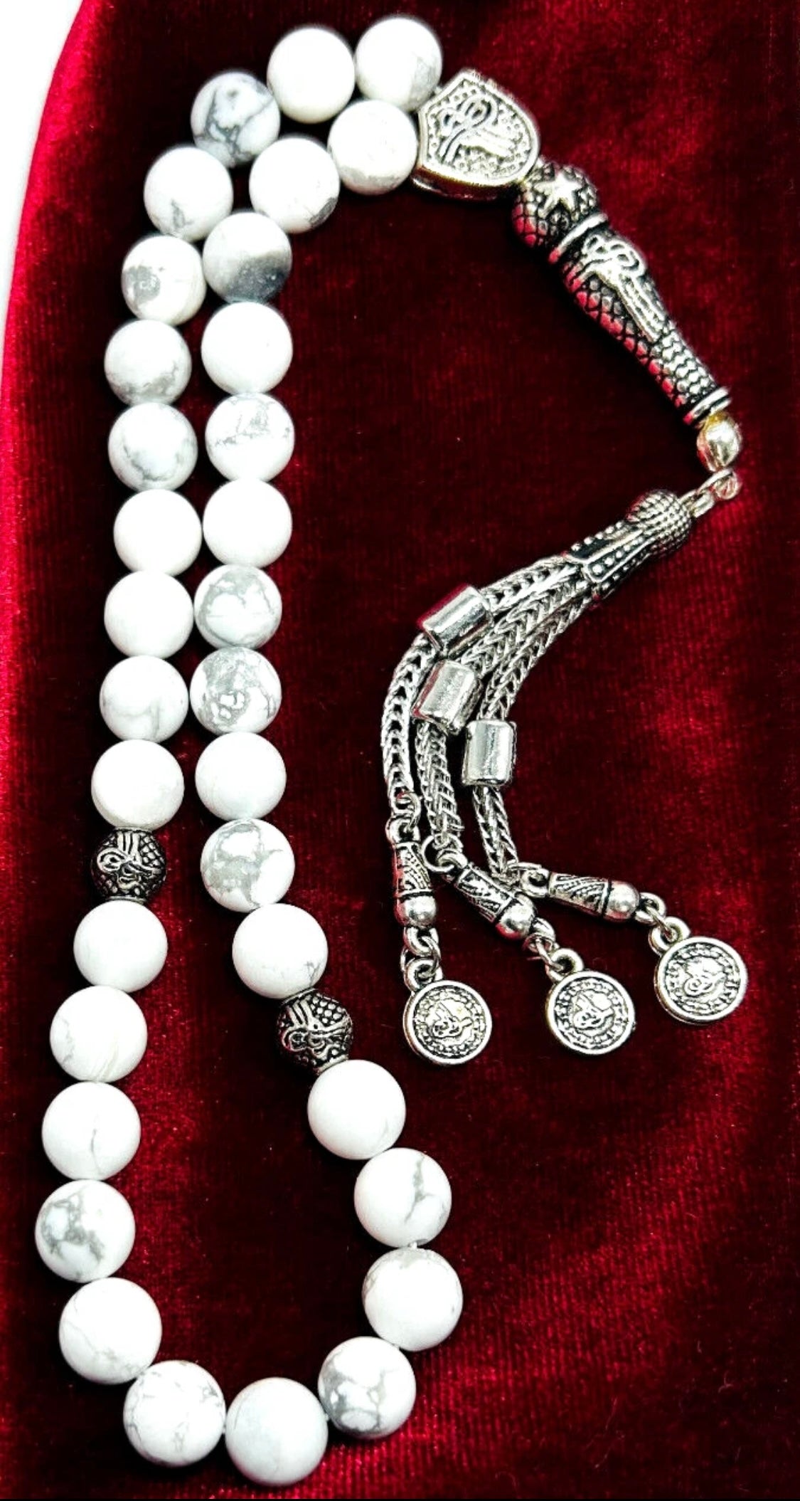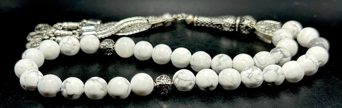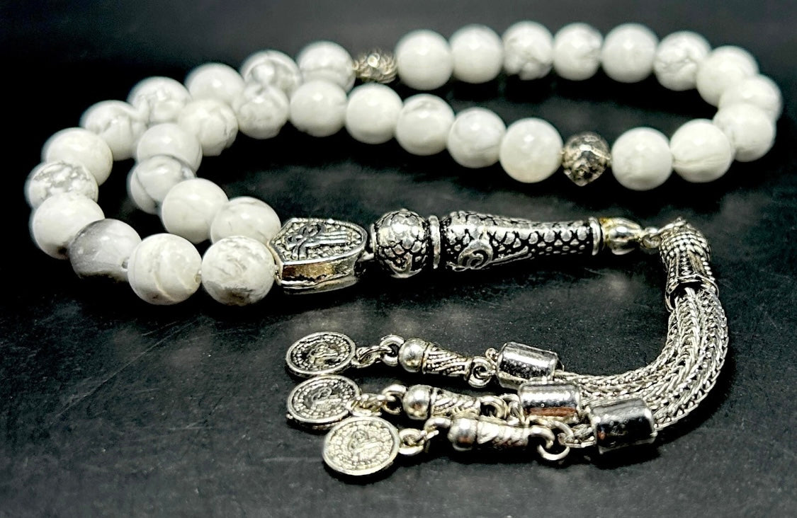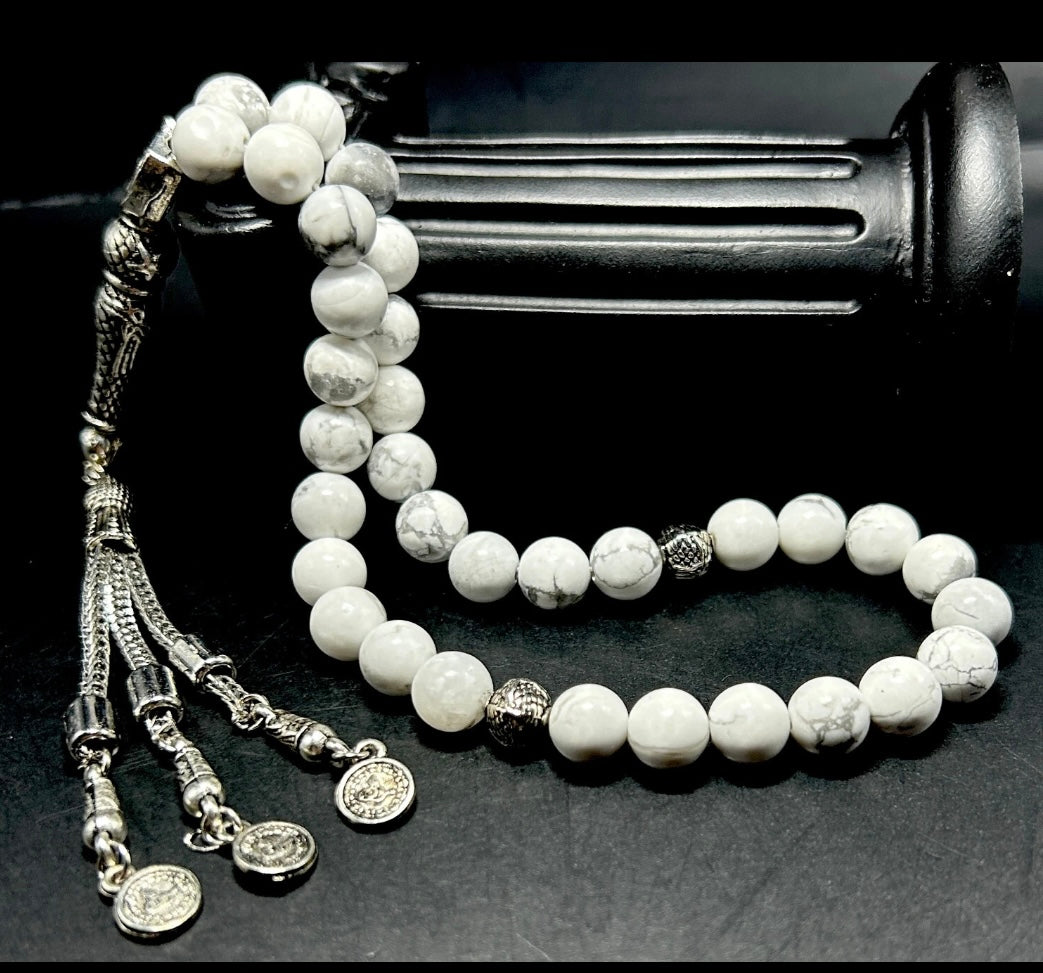 Verziert mit Metall-Elementen wie Quaste, Imame und Trennern (Ayrac) wird diese handgefertigte Tesbih zu einem wahren Hingucker. Der Howlit-Stein steht traditionell für Ruhe, Gelassenheit und innere Harmonie – perfekt für die tägliche Andacht oder als besonderes Geschenk.