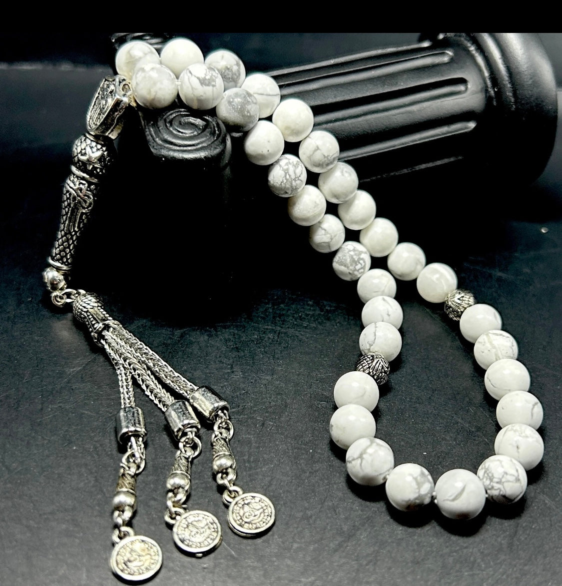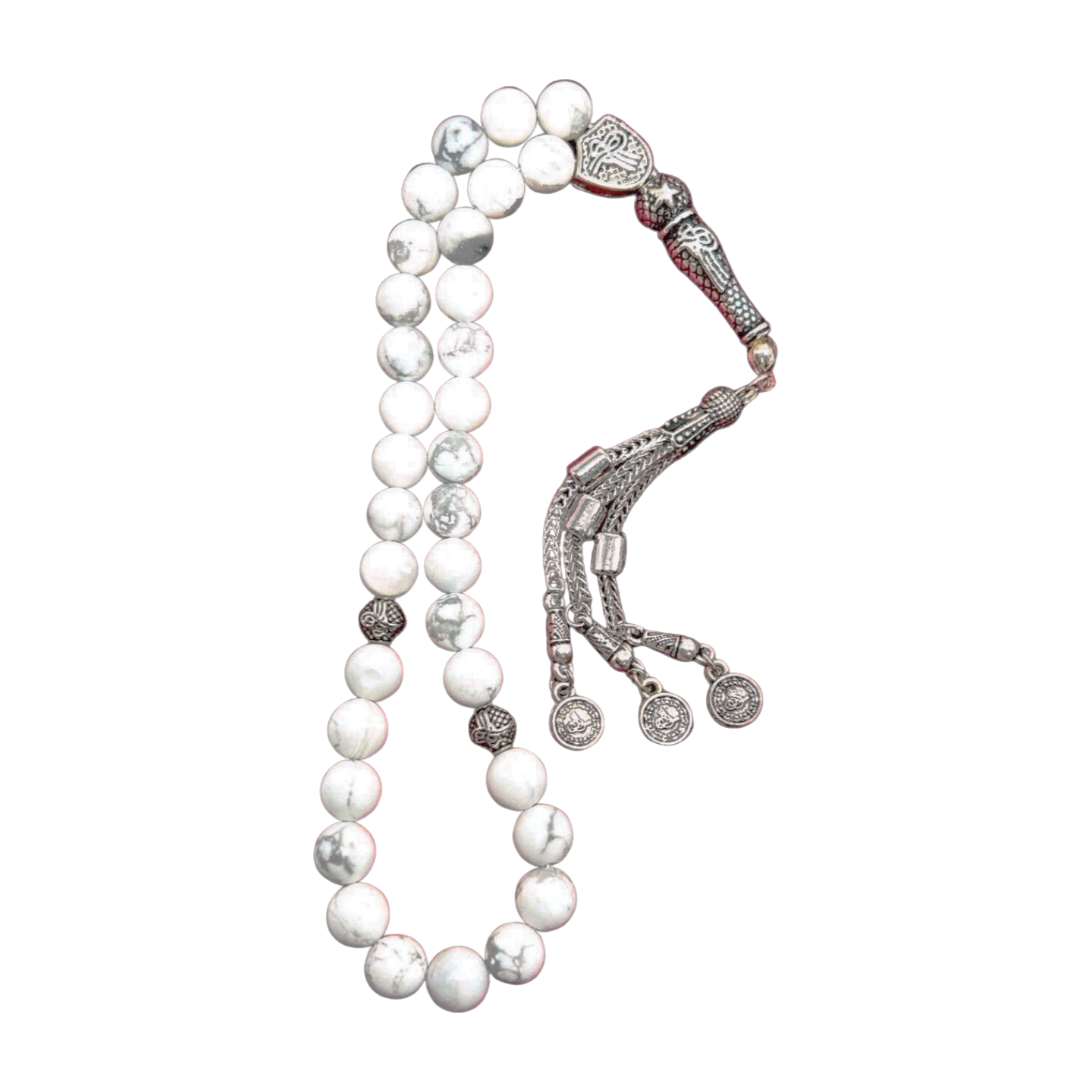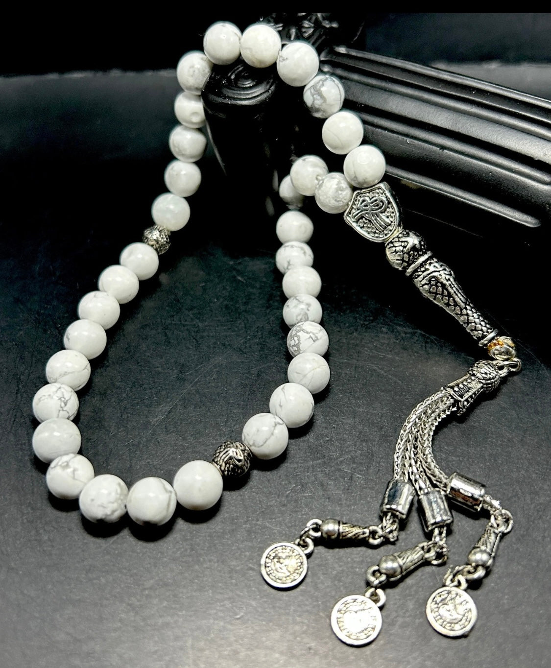 Verziert mit Metall-Elementen wie Quaste, Imame und Trennern (Ayrac) wird diese handgefertigte Tesbih zu einem wahren Hingucker. Der Howlit-Stein steht traditionell für Ruhe, Gelassenheit und innere Harmonie – perfekt für die tägliche Andacht oder als besonderes Geschenk.