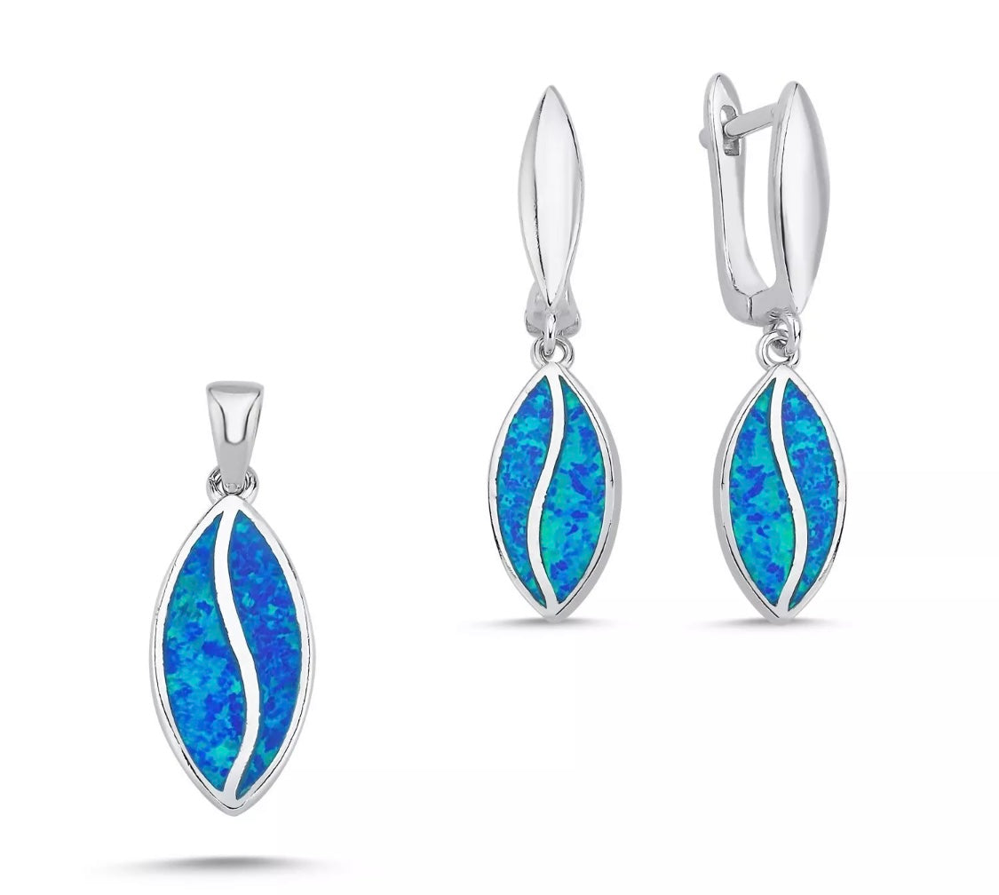 Die Opalsteine schimmern je nach Lichteinfall in intensiven Blautönen und sind kunstvoll in rhodiniertem Silber eingefasst – das schützt vor dem Anlaufen und sorgt für langlebigen Glanz. Dieses Set strahlt pure Eleganz aus und verleiht jedem Outfit einen Hauch von Luxus.