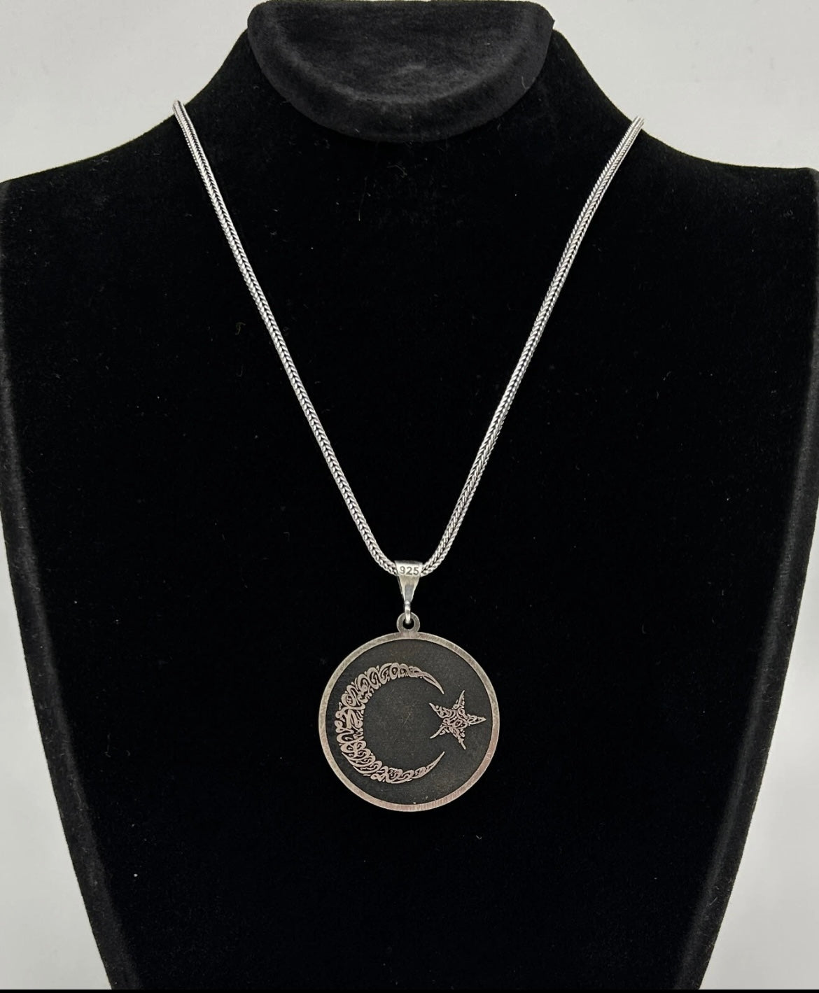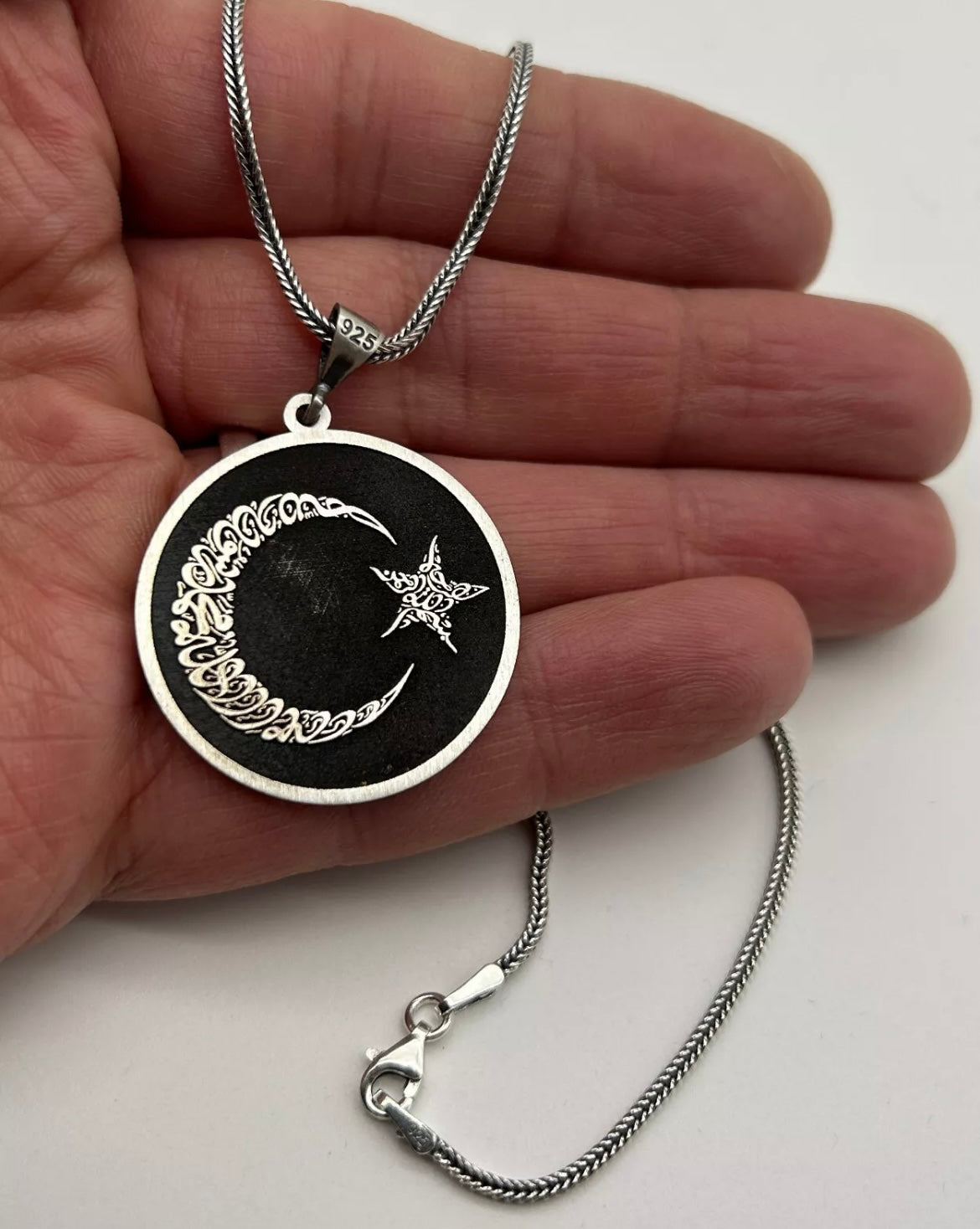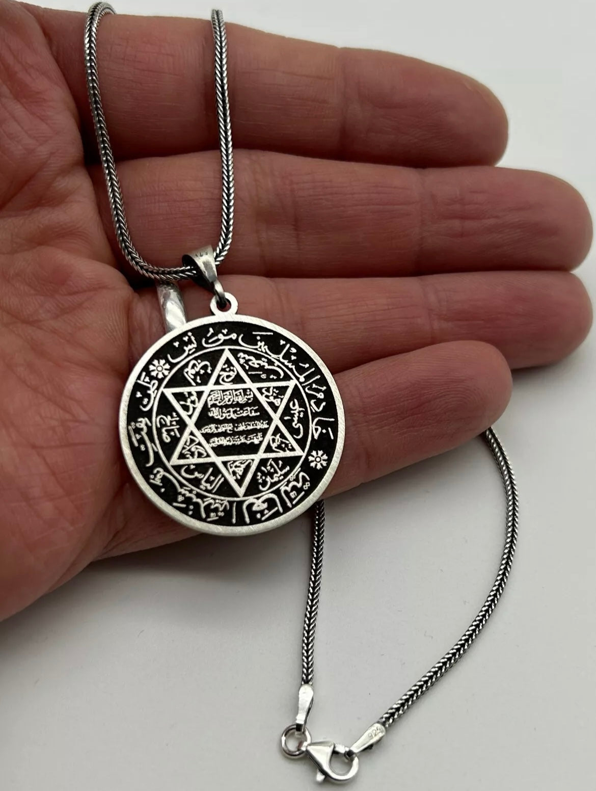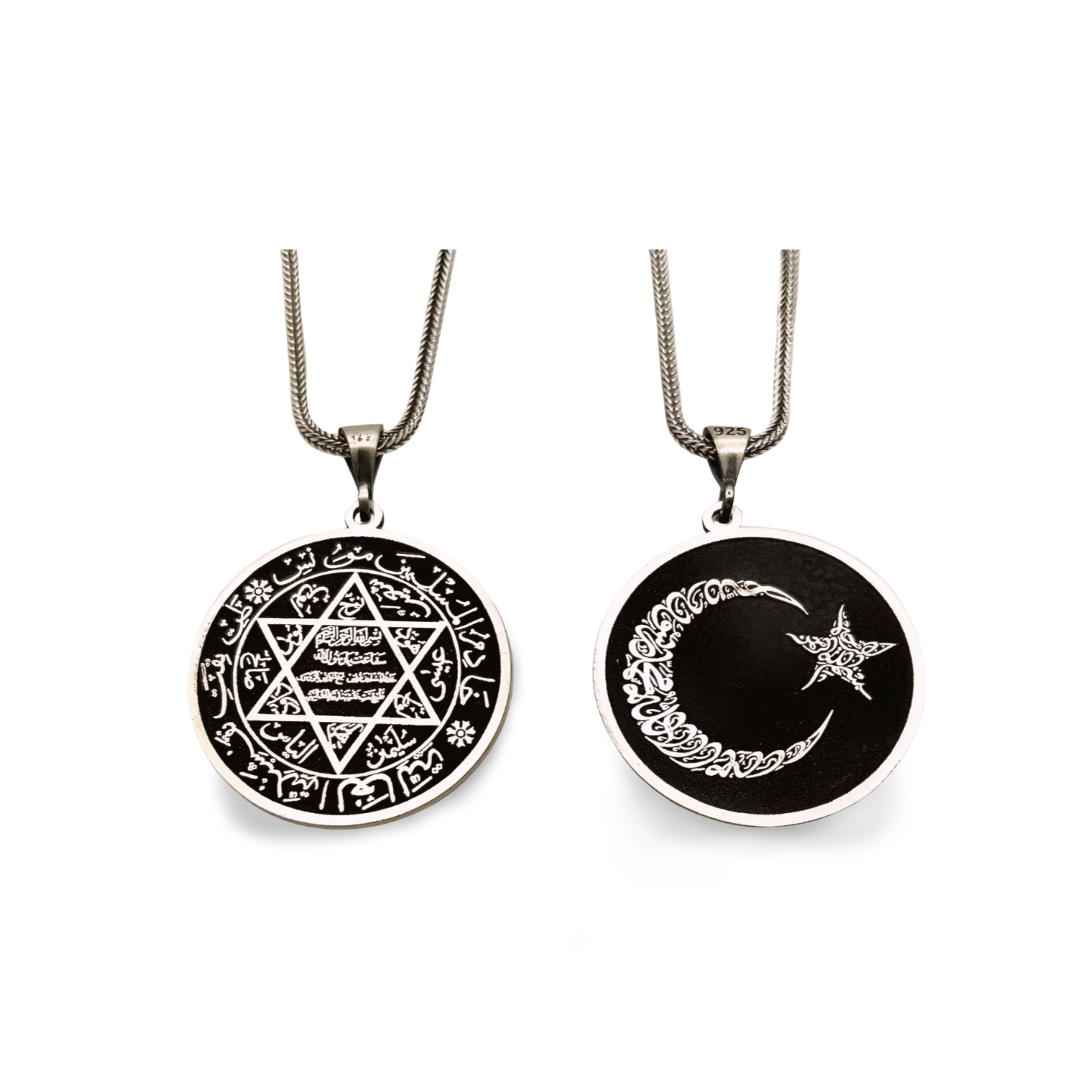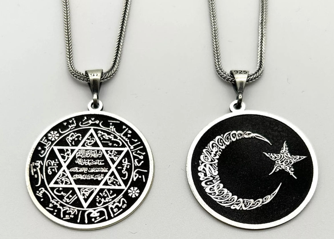 Ay Yıldız & Siegel Salomons Anhänger – 925 Silber mit 60 cm Kette | Kelime-i Tevhid - Hz.Süleyman | Doppelseitig
