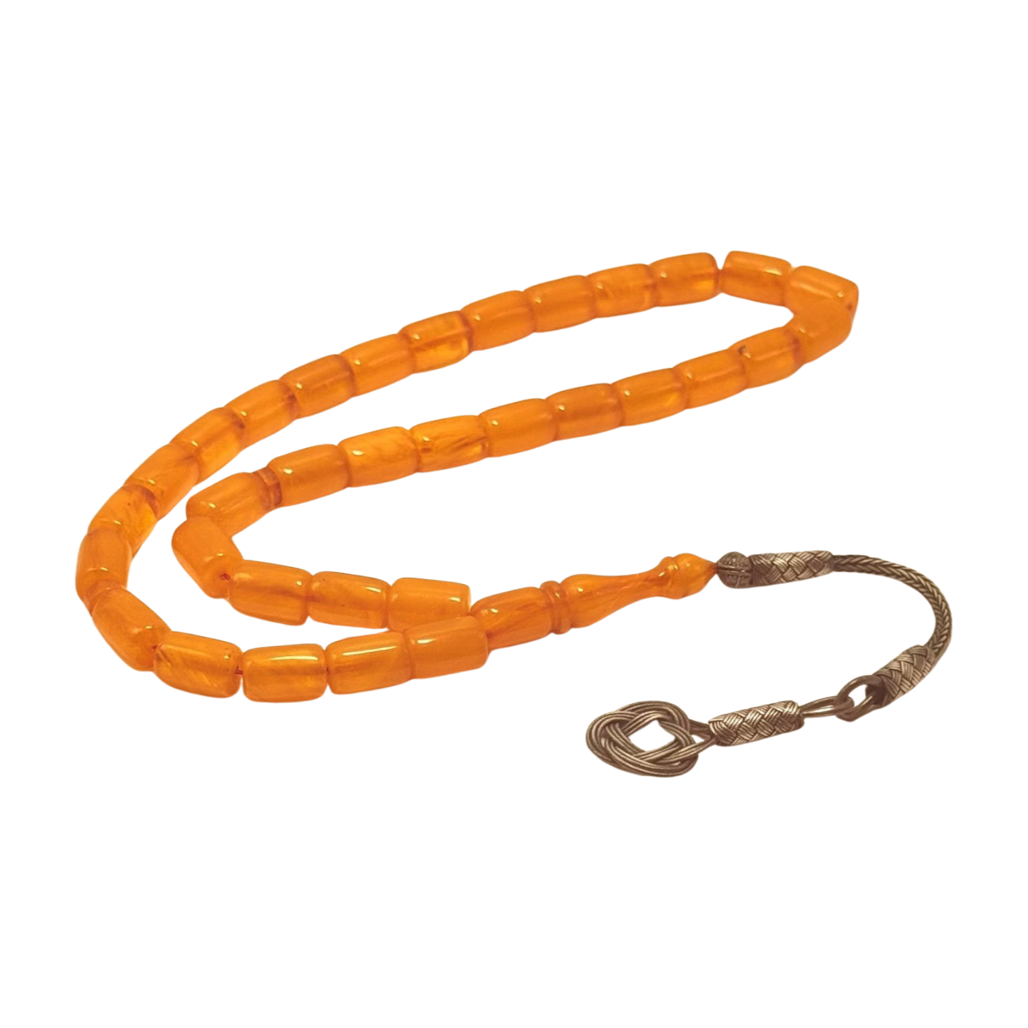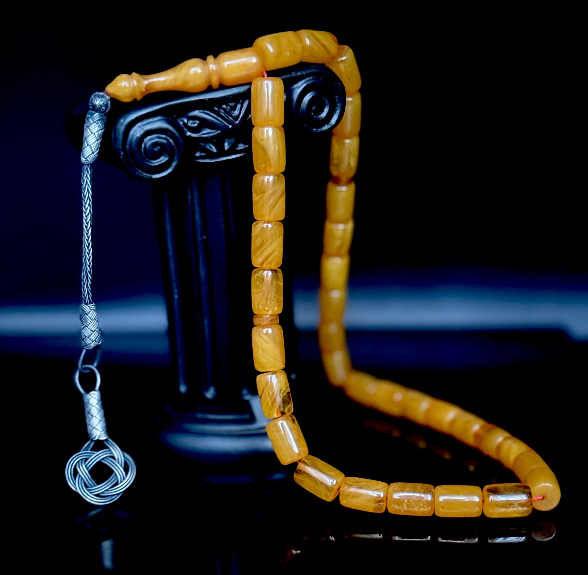 Das Modell mit Silberquasten und gepresstem Bernstein ist eine sehr elegante Art von Tesbih, die auch im Alltag verwendet werden kann. Das unverzichtbare Geschenk für besondere Anlässe sind gepresste Bernstein-Gebetsperlen, die als Geburtstags-, Valentinstags- oder Vatertags Geschenk für Männer in besonderen Zeiten gewählt werden können.