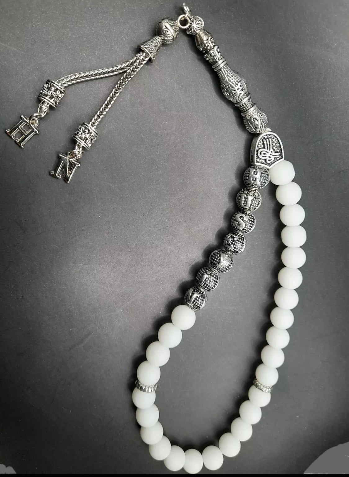 Diese handgefertigte Osmanli Tesbih Gebetskette vereint traditionelle Eleganz mit individueller Note. Sie besteht aus hochwertigen Natursteinperlen (8 mm) und ist mit einem edlen Metall-Püskül (Quaste) samt zwei frei wählbaren Buchstaben-Anhängern verziert.