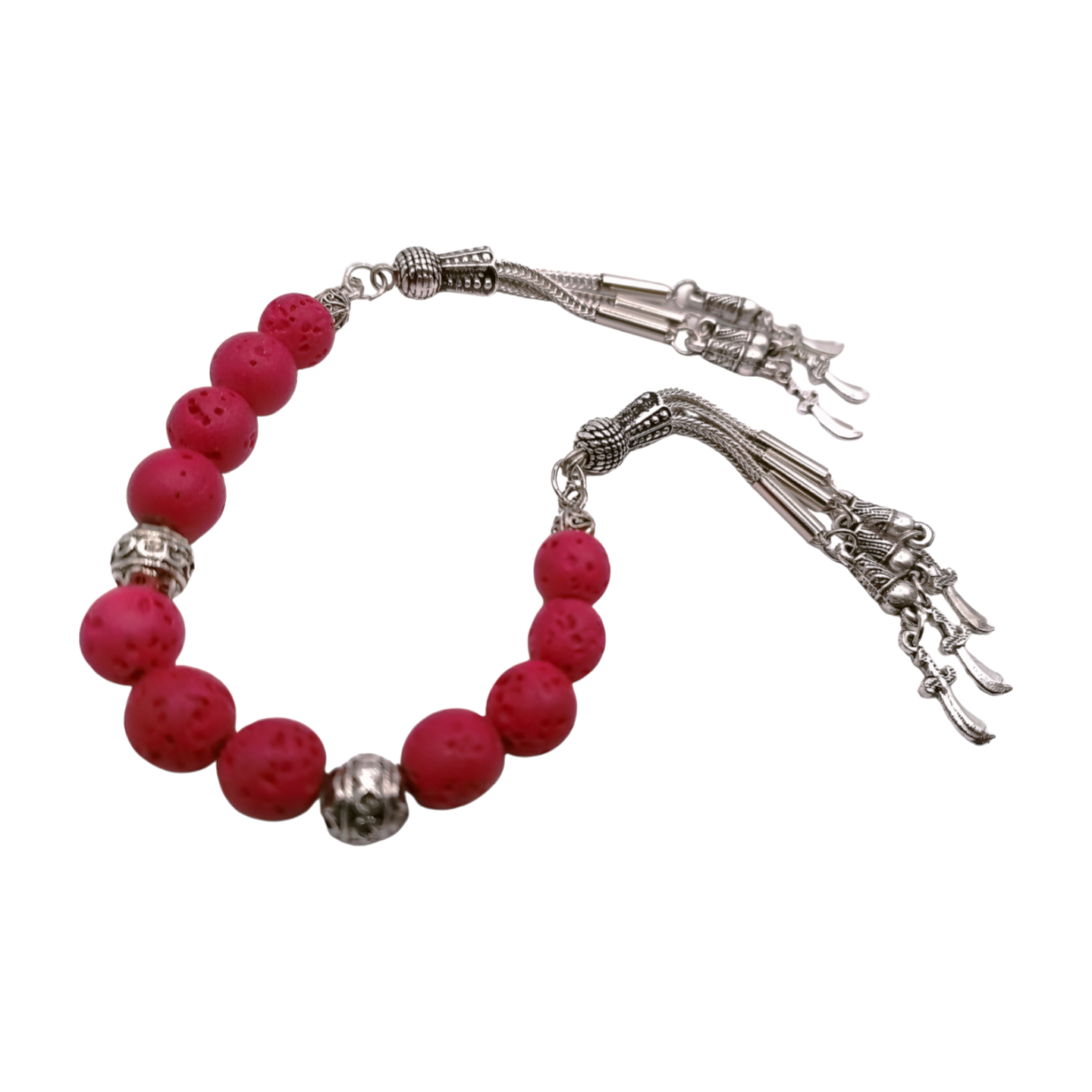 Diese kraftvolle Zaza Tesbih ist aus echtem roten Lavastein gefertigt und mit einem markanten Zülfikar-Püskül aus Metall versehen – ein Symbol für Stärke, Tapferkeit und spirituelle Tiefe. Die natürliche, poröse Struktur des Lavagesteins verleiht der Gebetskette eine besondere Haptik und macht sie zu einem einzigartigen spirituellen Begleiter.