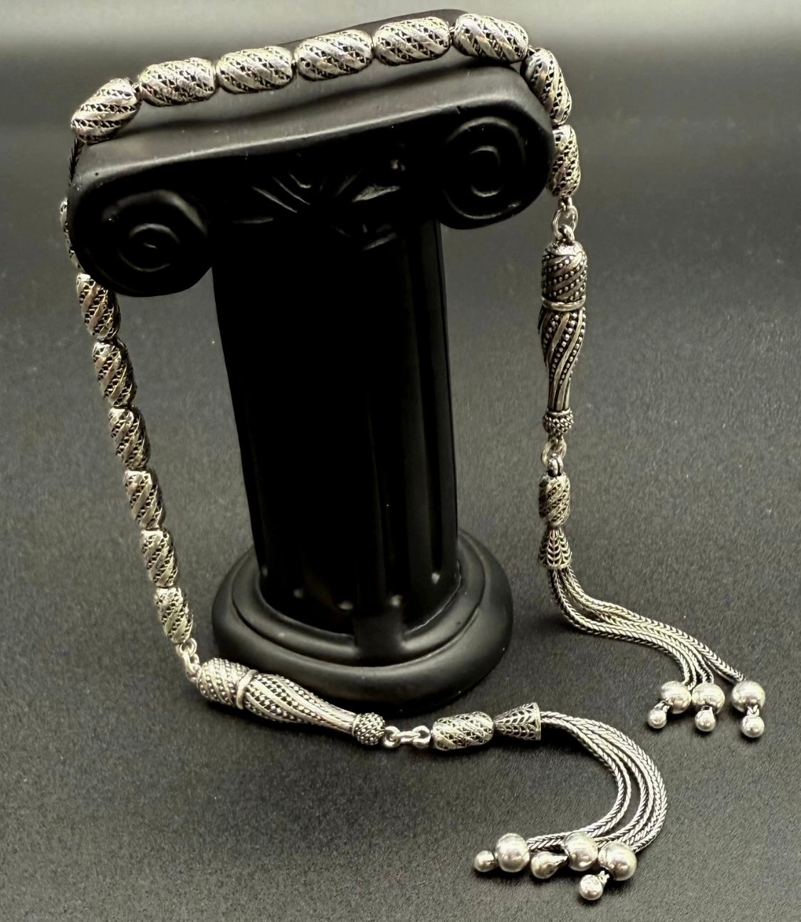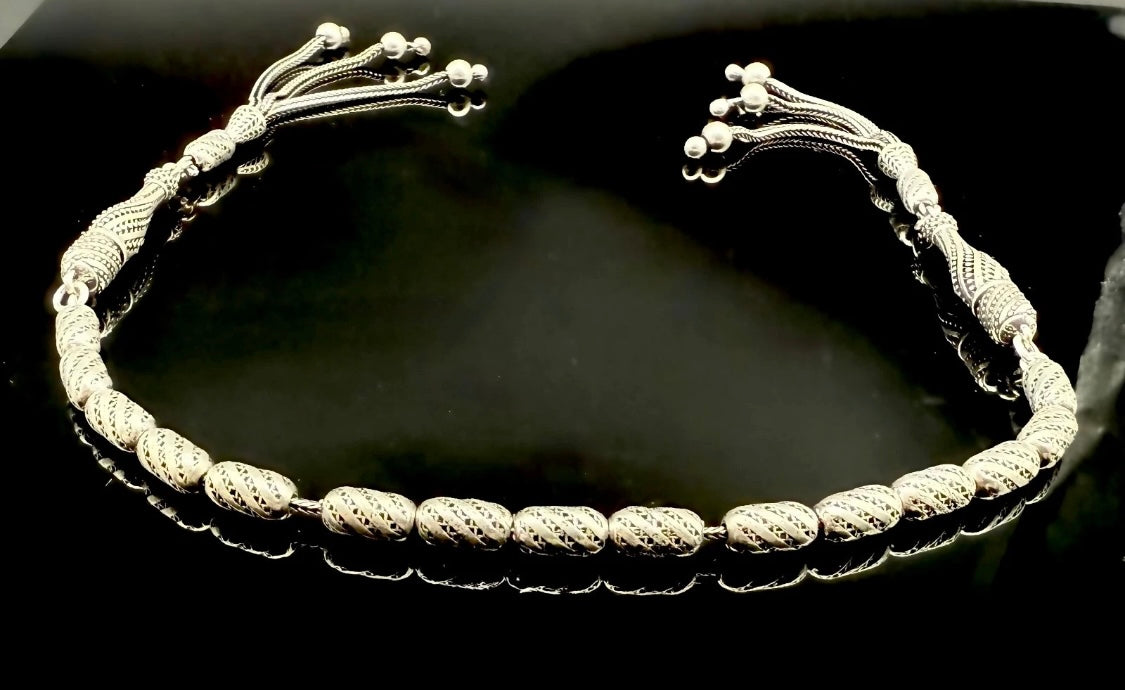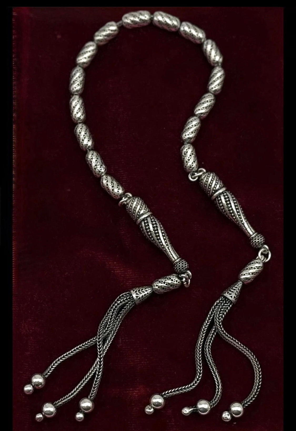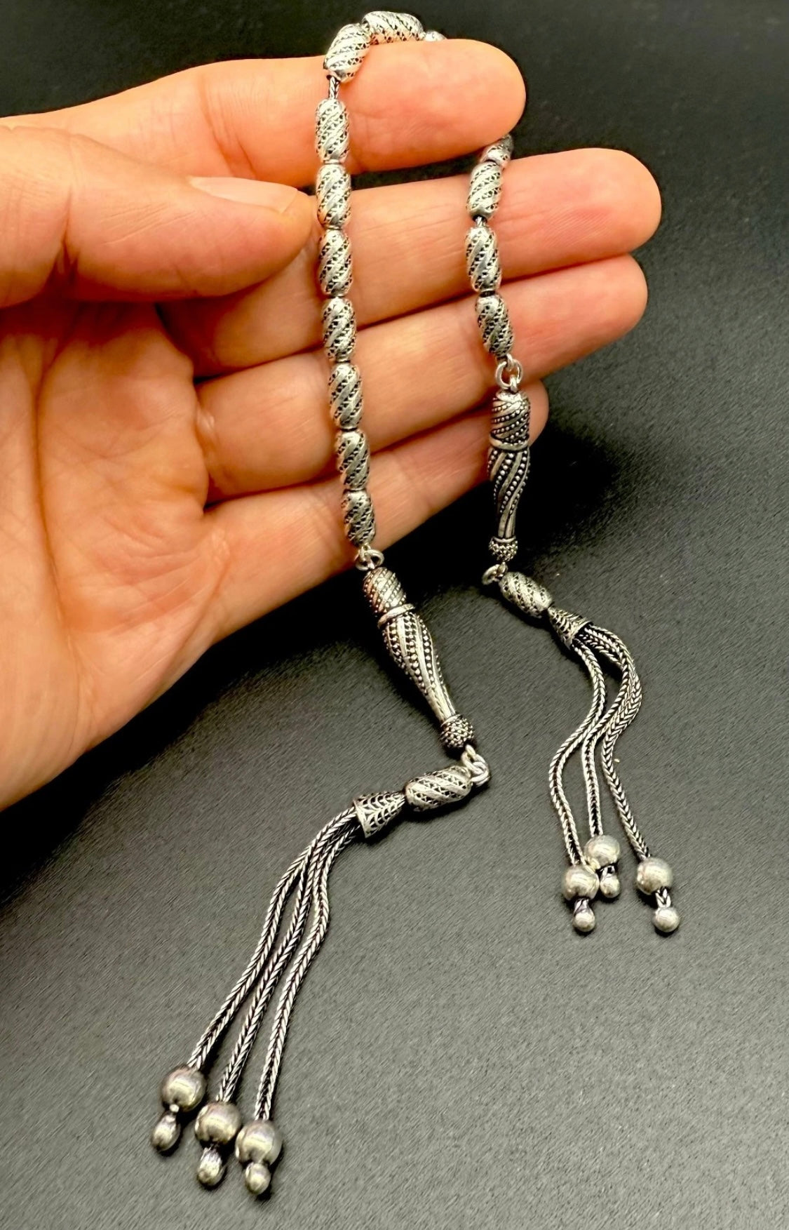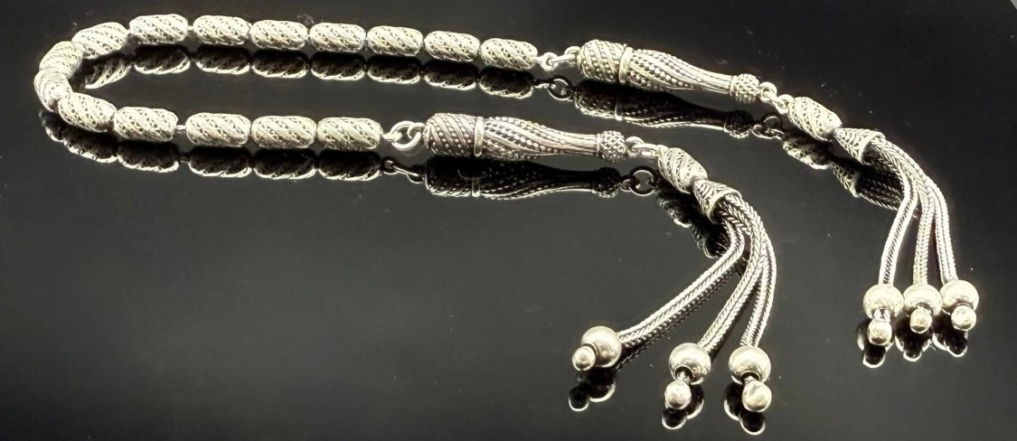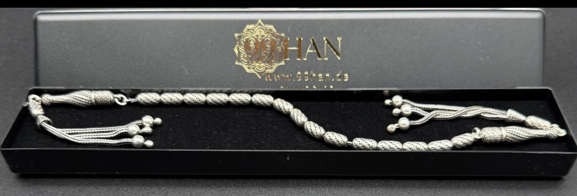 Dieses exklusive Zaza-Tesbih ist ein echtes Sammlerstück und wird vollständig aus 925er Silbern in Handarbeit gefertigt. Es ist außergewöhnlich verarbeitet und als doppelte Imame-Zaza-Tesbih gestaltet – eine meisterhafte Gebetskette mit einem einzigartigen Design.