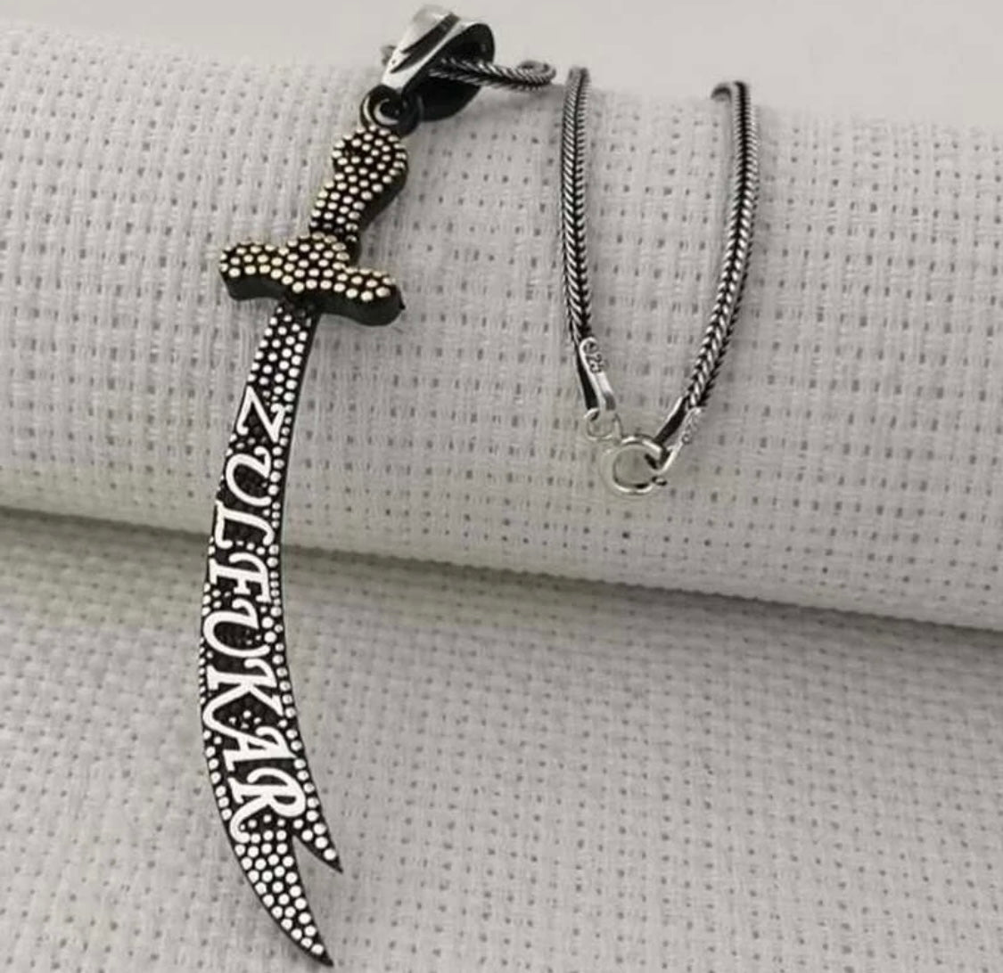Diese beeindruckende Herren-Halskette ist ein wahres Meisterwerk traditioneller Handwerkskunst. Sie besteht vollständig aus echtem 925er Sterlingsilber – sowohl der doppelseitige und detailreich gravierte Zülfikar-Anhänger als auch die massive Fuchsschwanzkette. Der Anhänger zeigt das legendäre Schwert von Hz. Ali