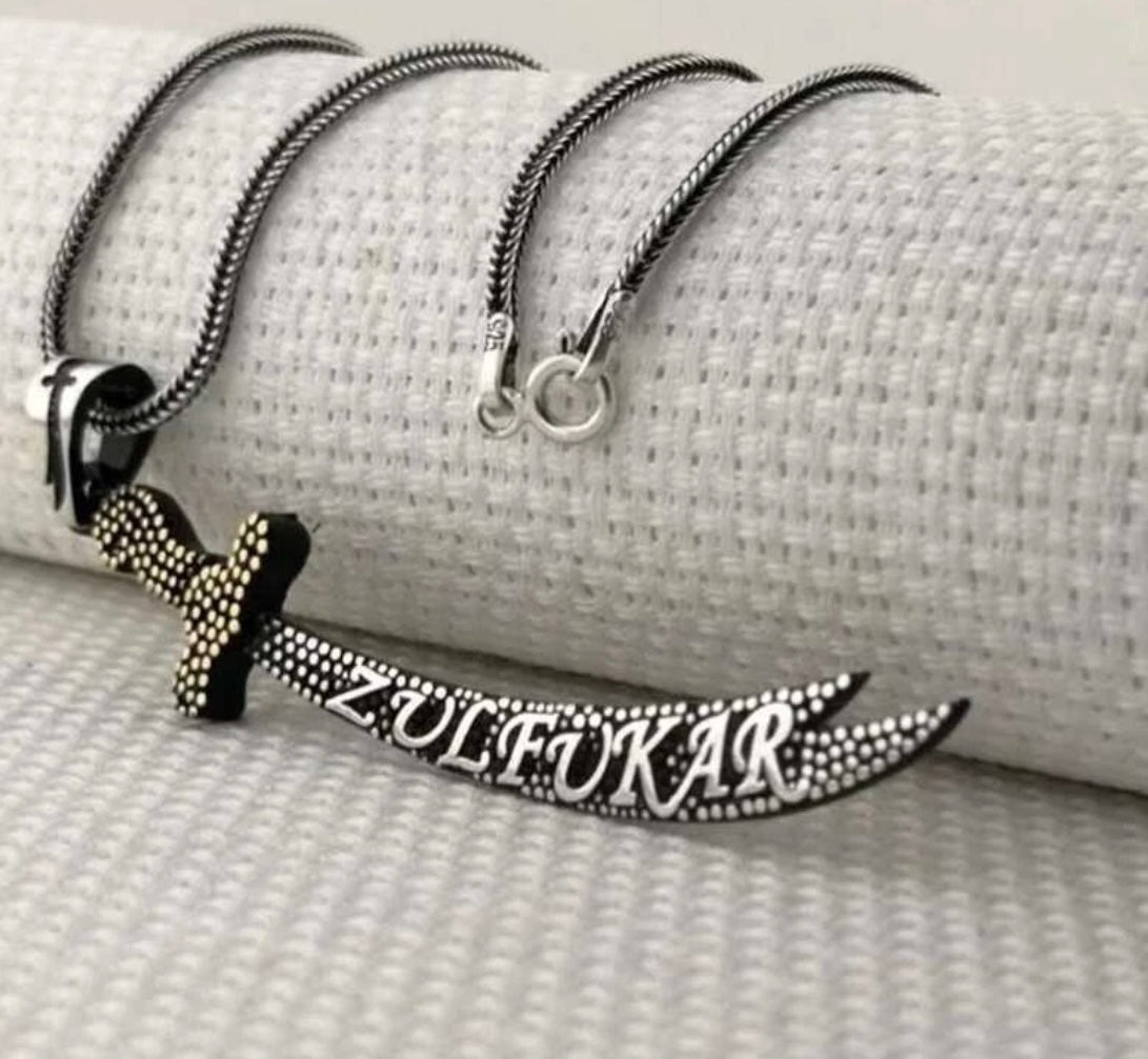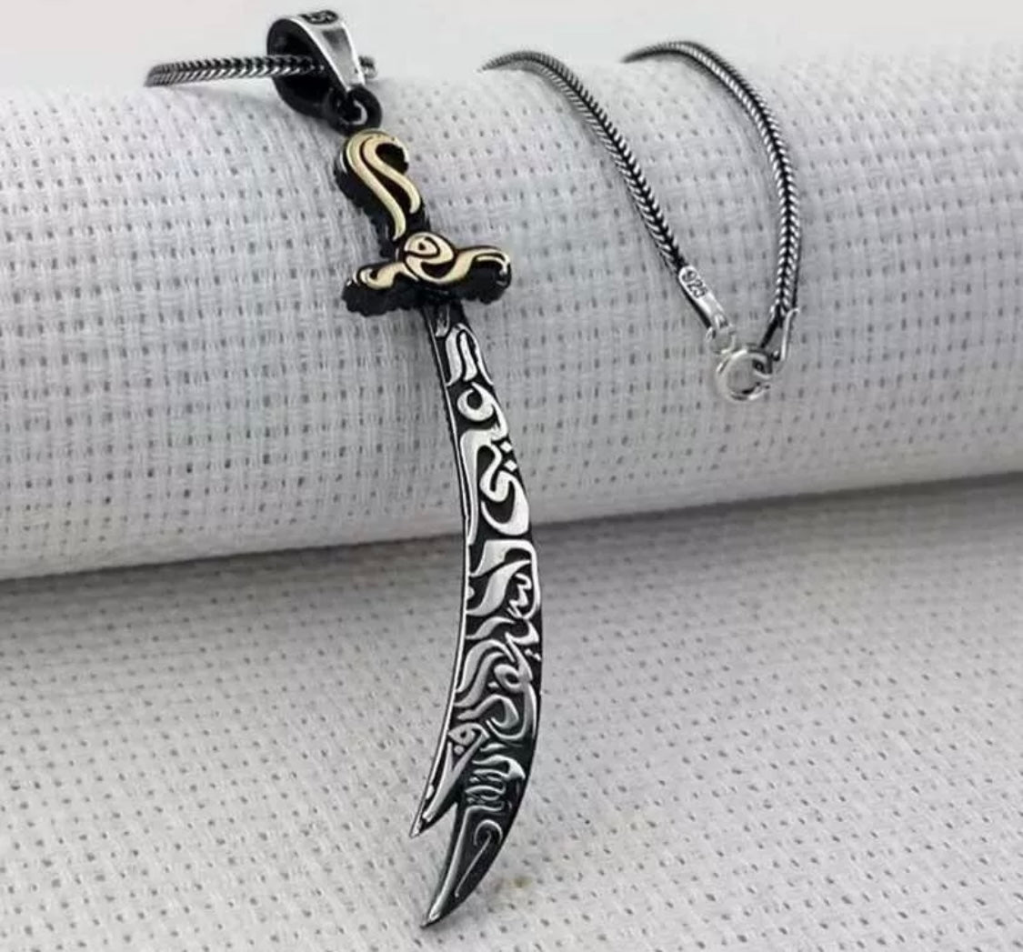 Zülfikar + mit 55 cm Kette doppelseitig - Dhu l-faqar 925 Silber Hz. Ali Schwert Anhänger